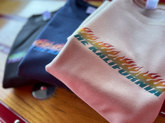 THE KALIFORNIA フレイムスロゴをプリントしたスウェットです。 裏起毛であったかいです。 ボディカラーとプリントカラー()内は、 ・ネイビー(赤〜黄色) ・スミクロ(紫〜みどり〜青) ・インディゴ(青〜オレンジ〜ピンク) ・サンドベージュ(ターコイズ〜黄色〜赤) ・アイビーグリーン(オレンジ〜青〜黄色) ・バーガンディ(黄色〜紫〜みどり) ・ダークブラウン(みどり〜黄色〜赤) の7種類です